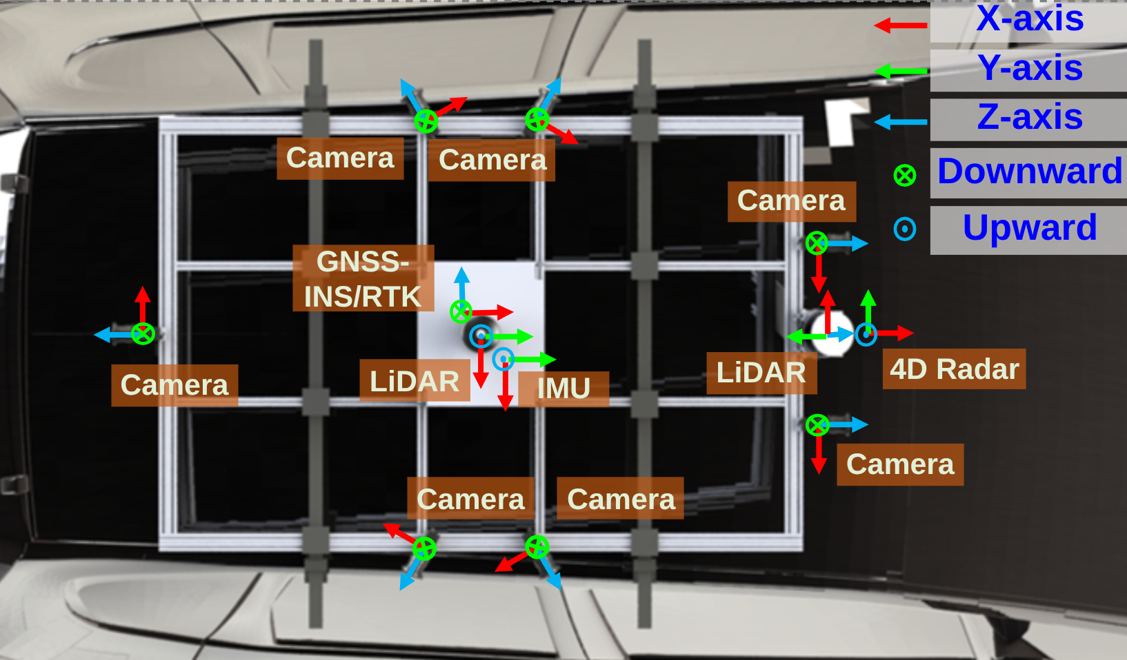 Furthermore, for cameras, the GigE Vision protocol is used to broadcast action commands over the network, enabling synchronous triggering of Ethernet cameras with a trigger precision of less than 0.005 seconds. All data is transmitted to the onboard computer through this system architecture and simultaneously recorded in rosbag format. The current trigger frequencies are set as follows: LiDAR and cameras at 10 Hz, IMU at 400 Hz, 4D radar at 13 Hz, GNSS at 1 Hz, and UWB at 50 Hz.